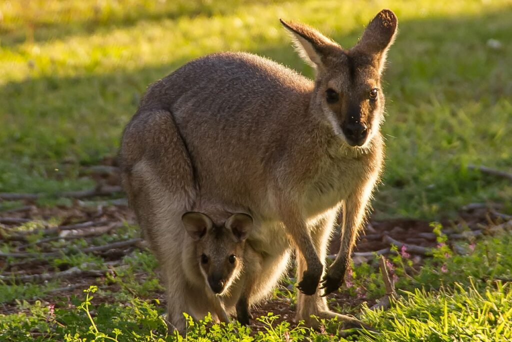 Look! I found a mother kangaroo holding her child in her pouch.(見て! カンガルーのお母さんが袋の中で子供を抱いている。)